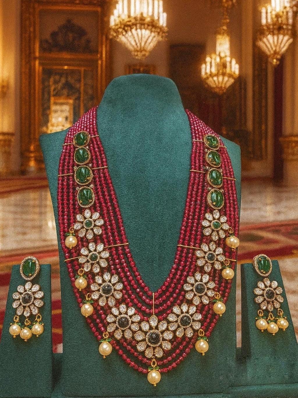 Moissanite Kundan Long Haram Necklace Set with Ruby Beads & Emerald Accents | Bridal Wedding Jewelry With Earrings Sabyasachi Inspired