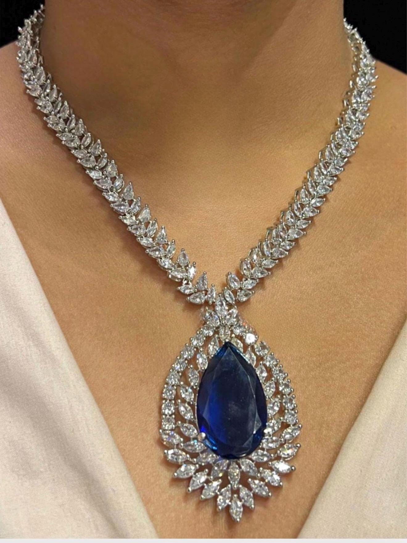 Sabyasachi Inspired CZ zirconia blue premium quality jewelry set, with earrings, American Diamonds Set, next to real diamonds