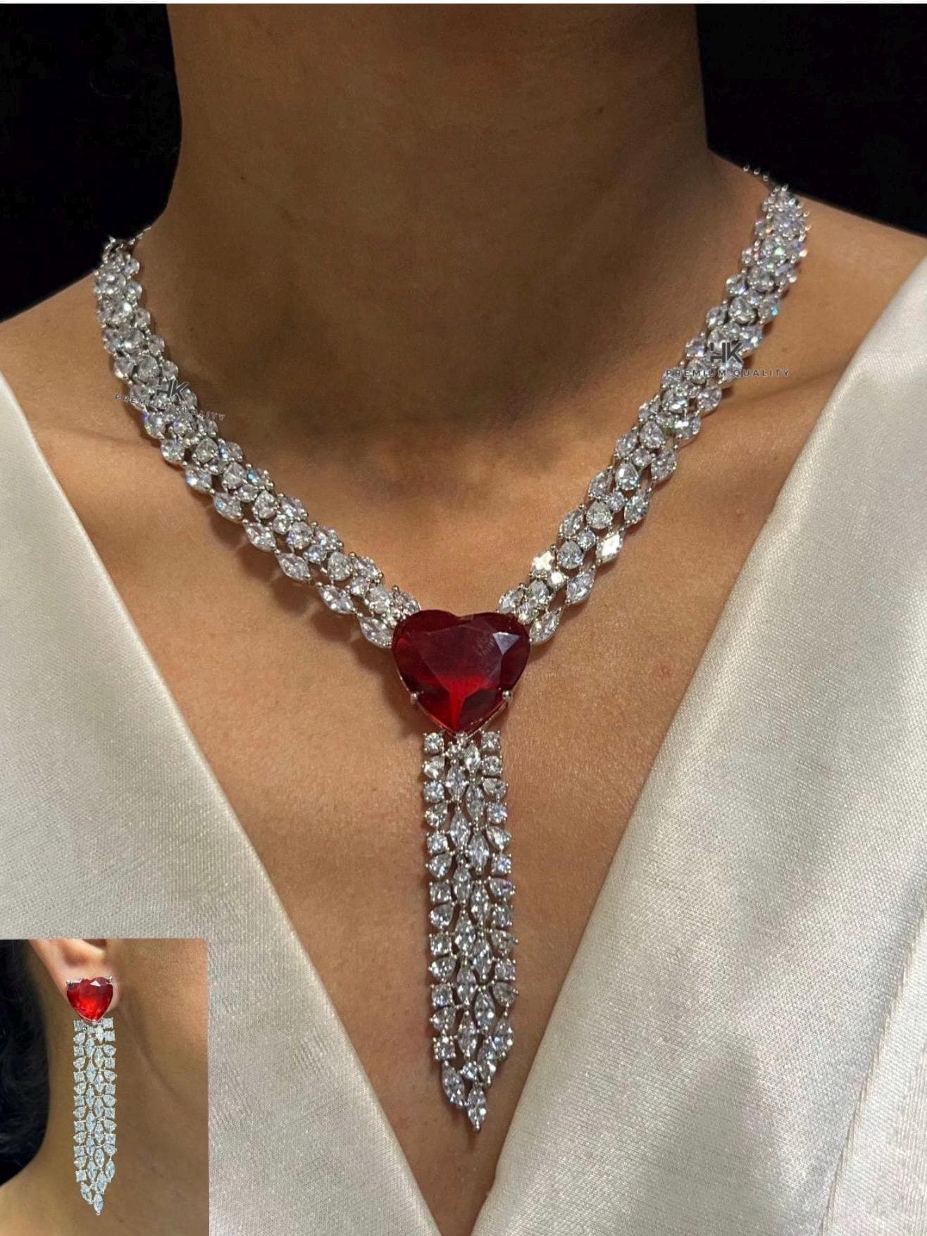 CZ Ruby Heart Necklace & Earrings Set: Sabyasachi Inspired Bridal Jewelry