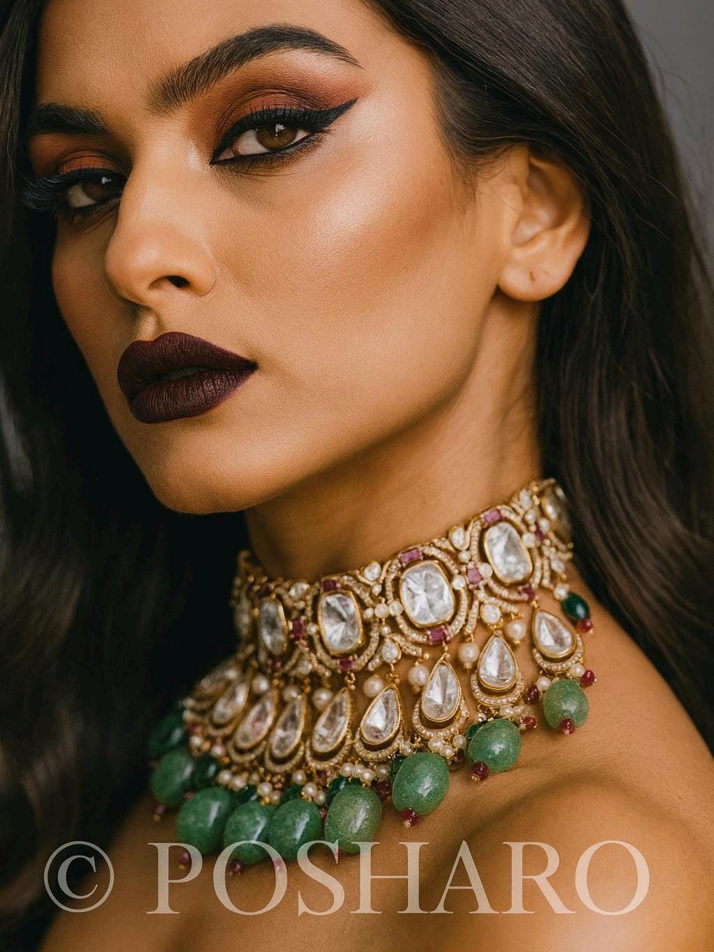 Moissanite Polki Choker Set: Green Emerald, Kundan Gold Plated Bridal Necklace