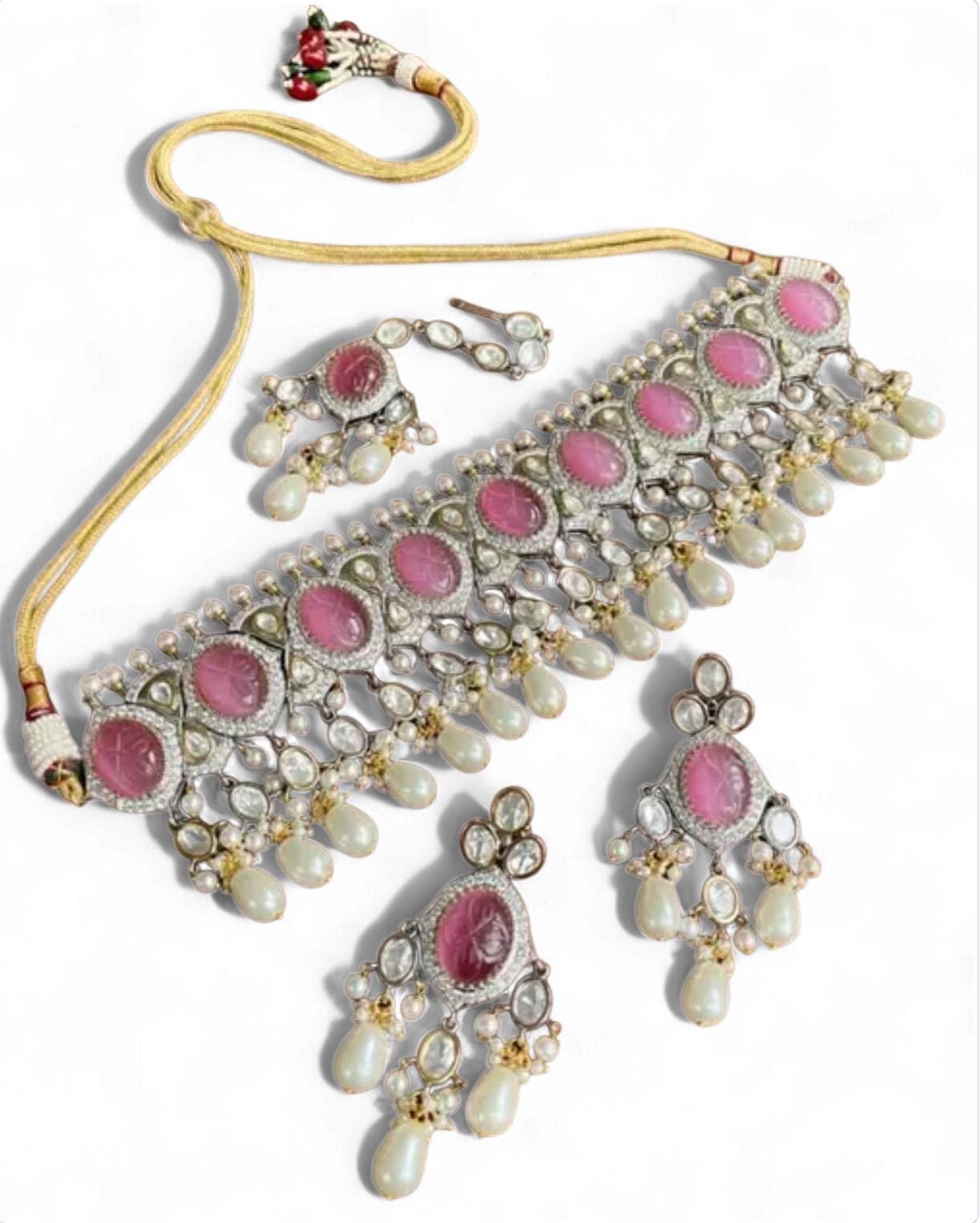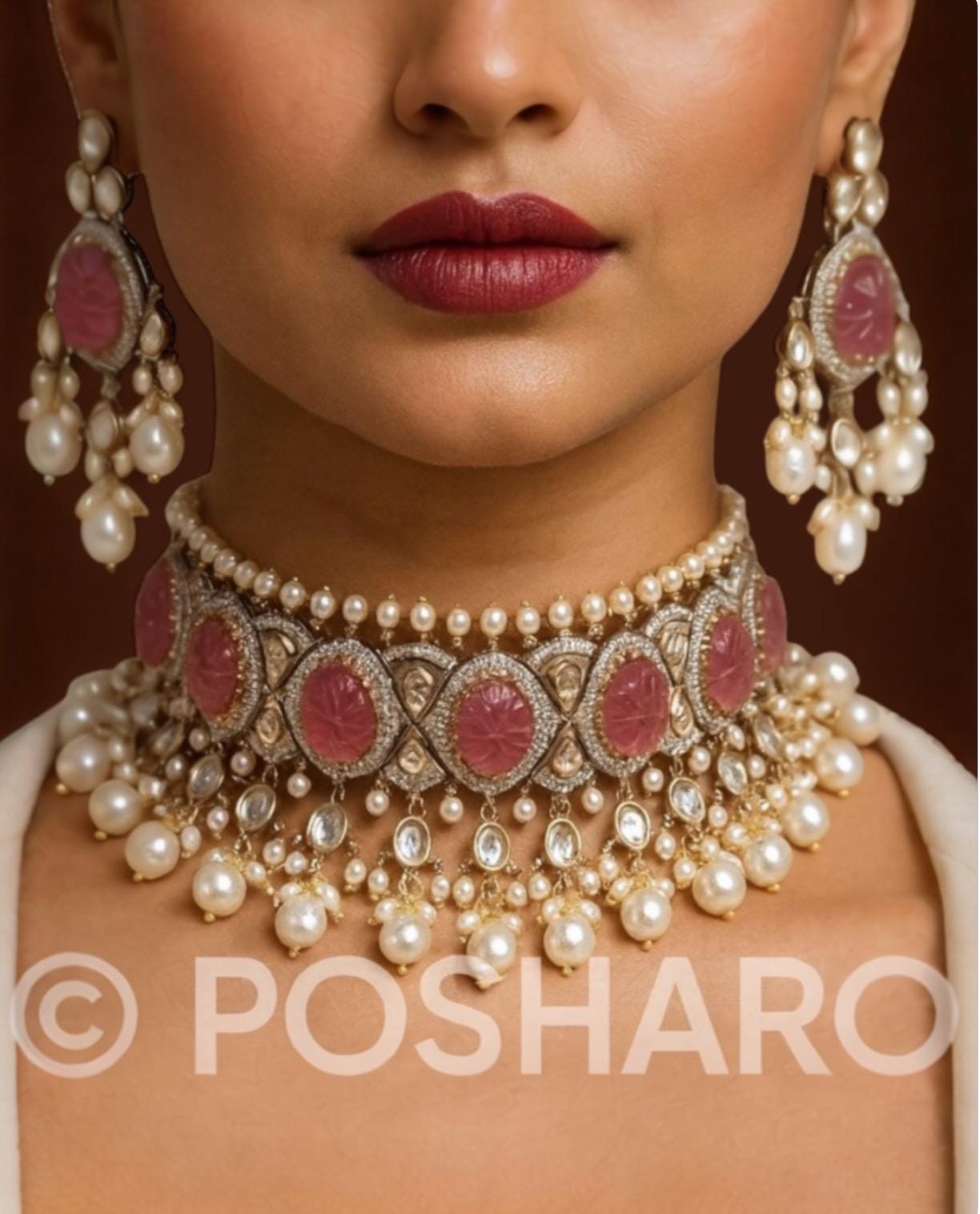 Add a touch of timeless elegance to your jewelry collection with this stunning and traditional fusion polki choker Necklace Set. Featuring a beautifully designed necklace adorned with sparkling and vibrant polki kundan stones, this set is perfect for special occasions or adding a statement to your everyday style.