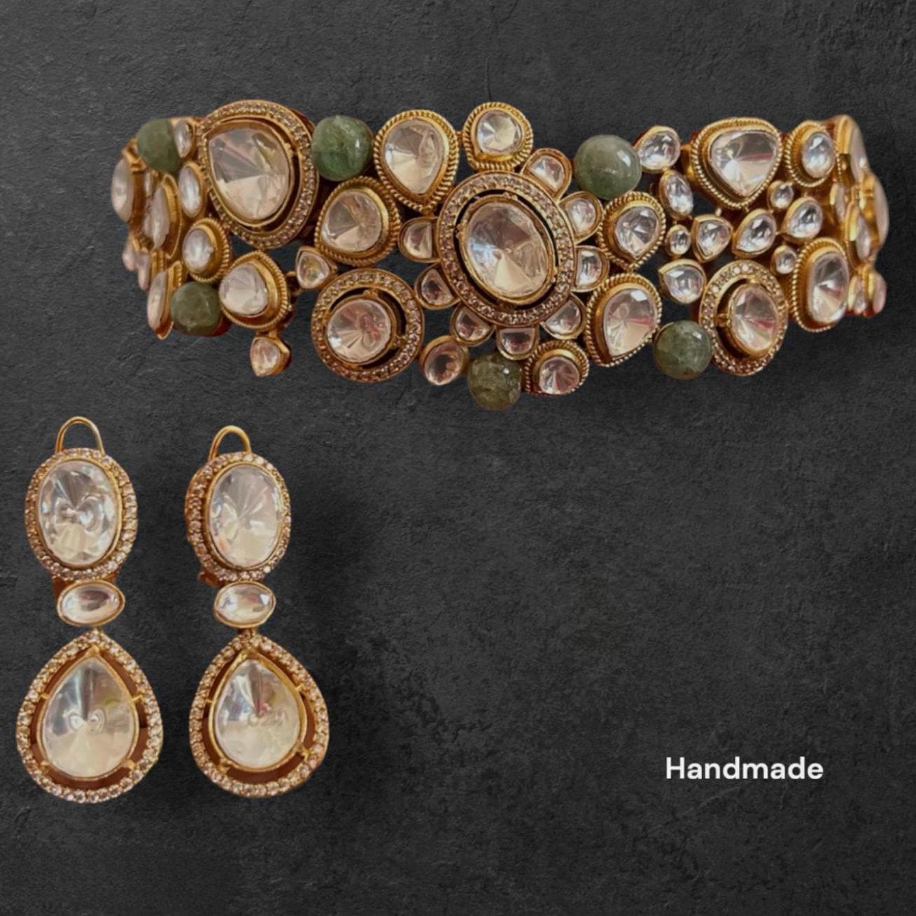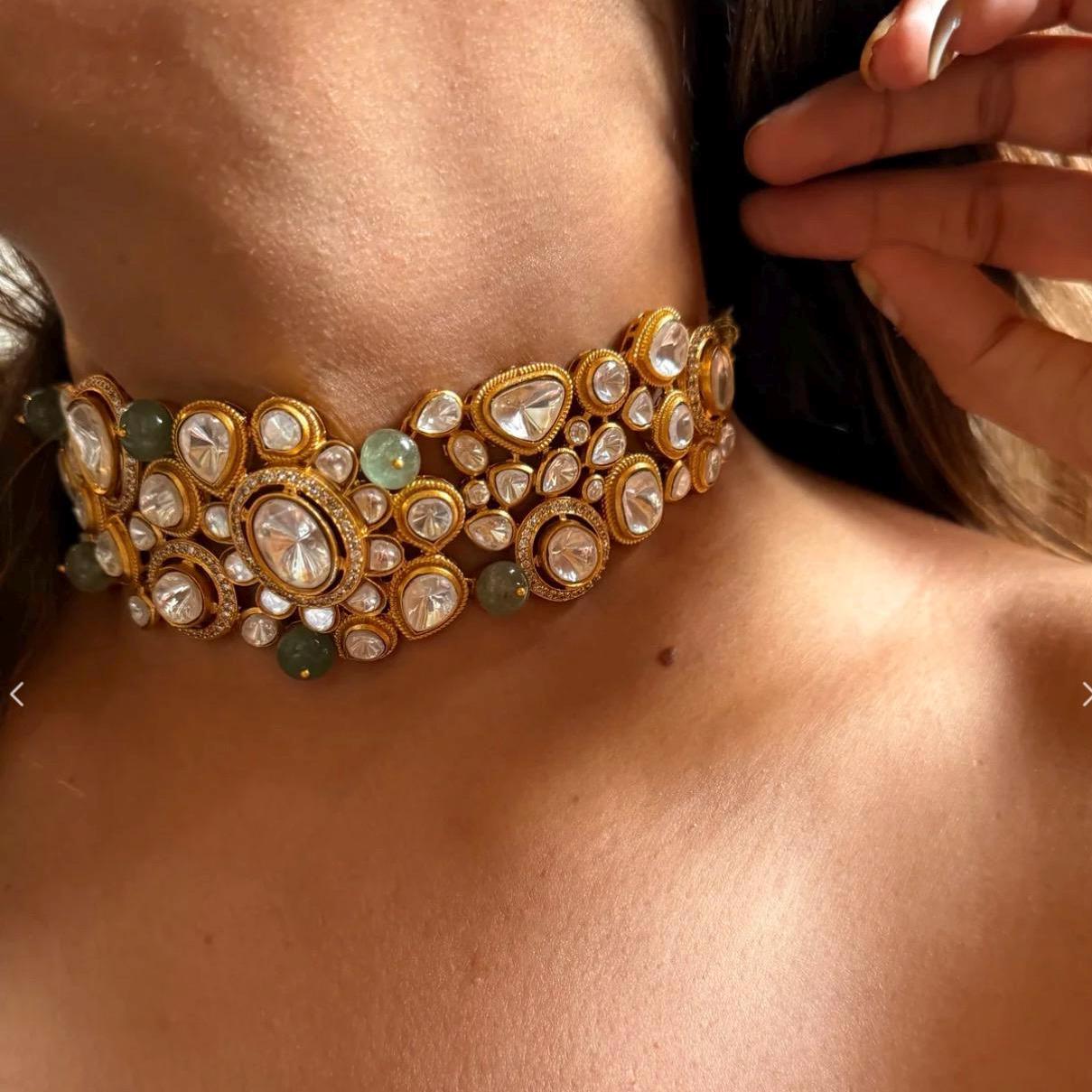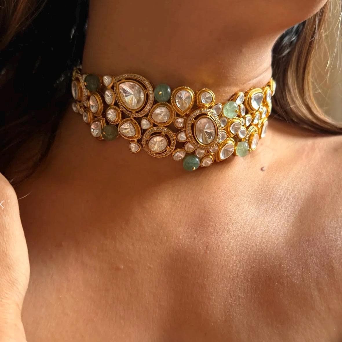 Bollywood Moissanite natural Emerald silver foil Polki Sabyasachi Inspired Necklace Set/Uncut Kundan gold plated/Reception Bridal Choker Set