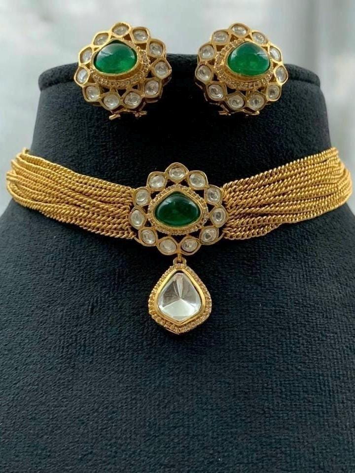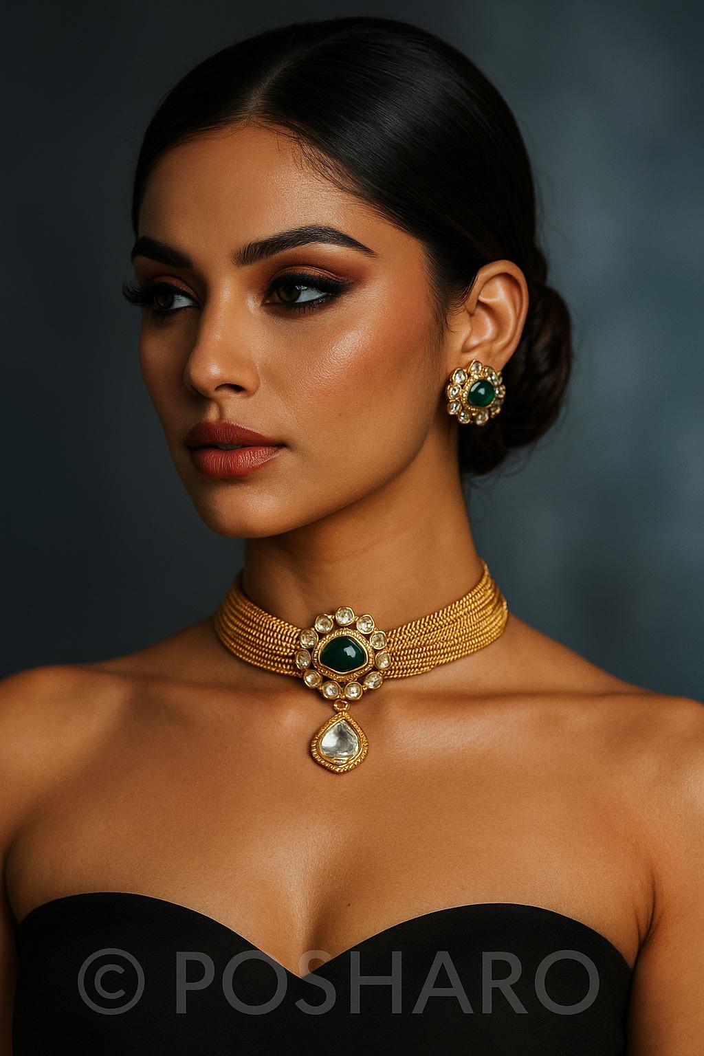 At the center, a vibrant emerald doublet stone steals the spotlight, sparkling with every movement. The neckline is crafted with delicate gold-toned chains, offering a modern, lightweight, and luxurious feel.