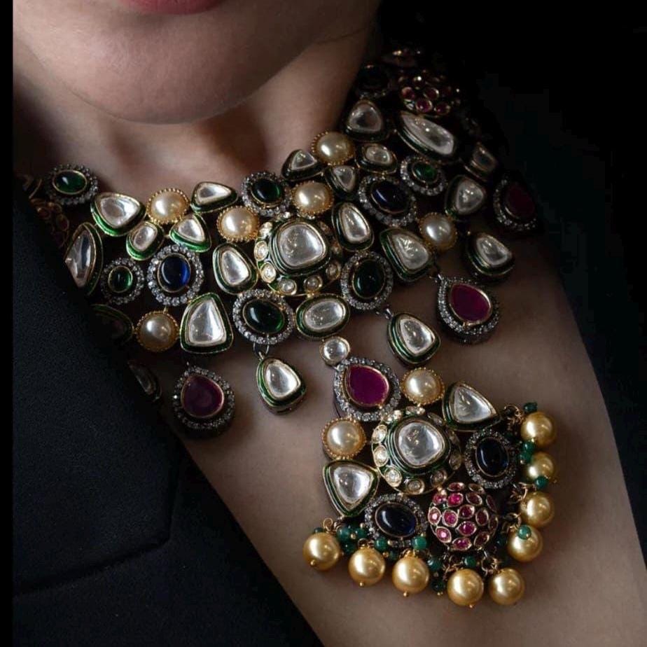 Elevate your style with this breathtaking Polki Kundan statement necklace, handcrafted by skilled artisans of India. This regal piece features a stunning combination of uncut Polki stones, vibrant green, red, and blue accents, and golden pearl drops, all set in a luxurious traditional design.
