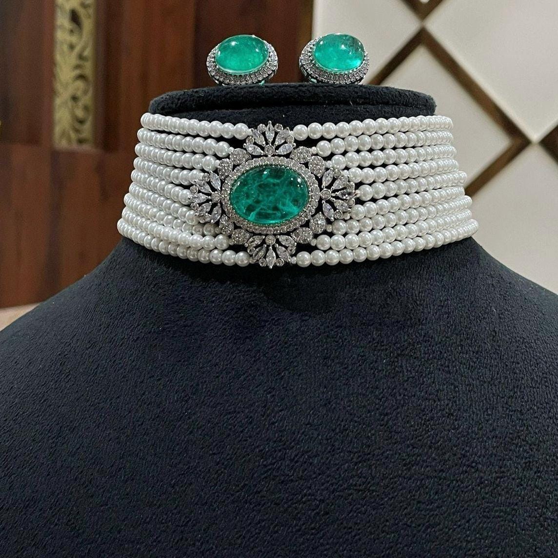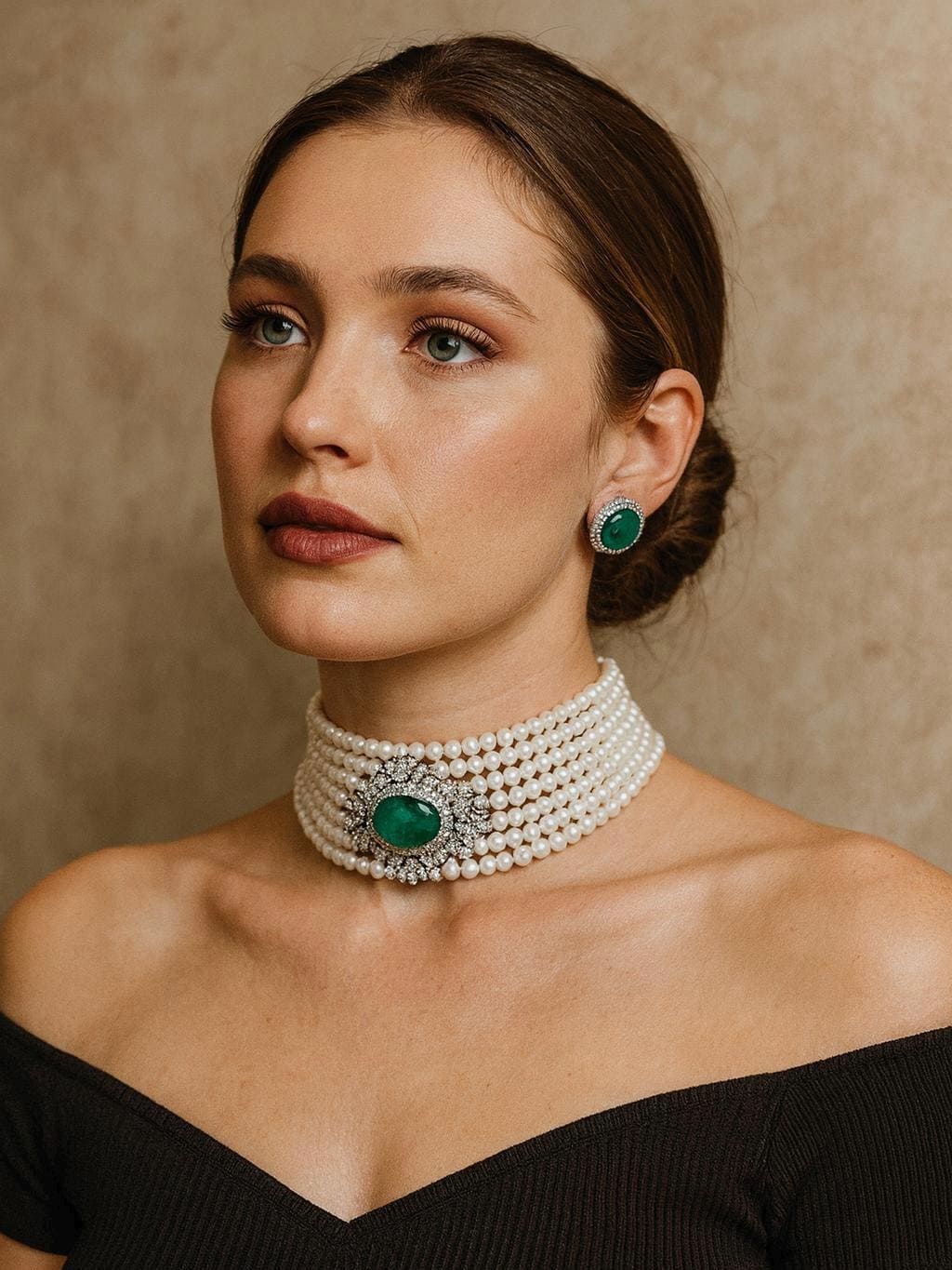 Elegant Pearl & CZ Emerald Choker Necklace Set | Statement Bridal Jewelry