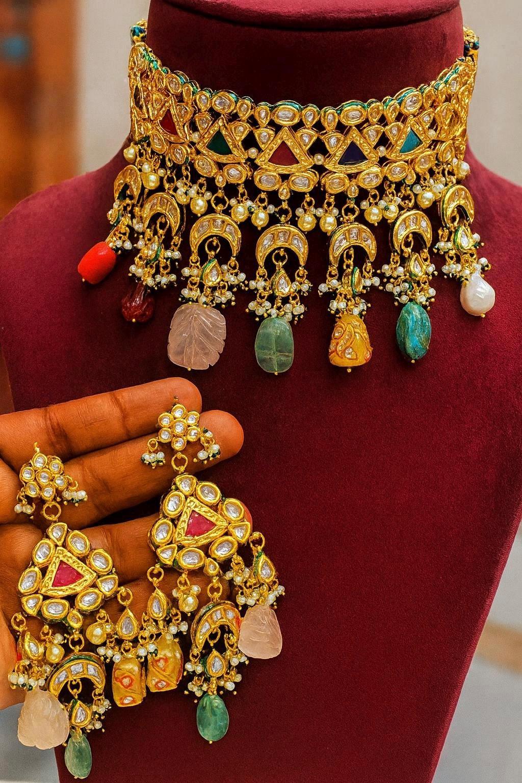 Multicolor Kundan Choker Necklace Set | Bridal Indian Jewelry | Statement Choker with Earrings | Semi-Precious Stones