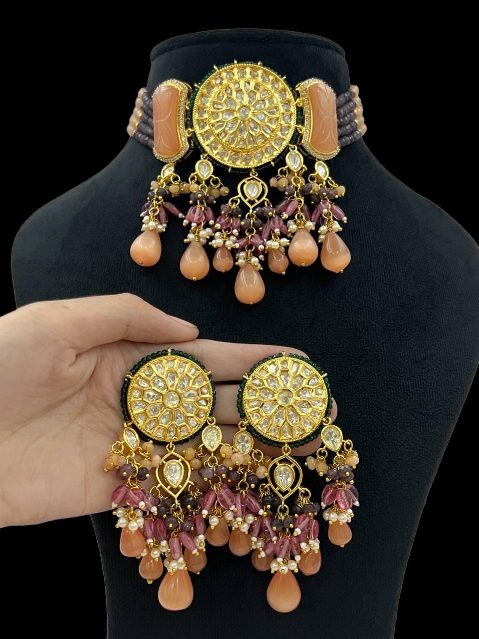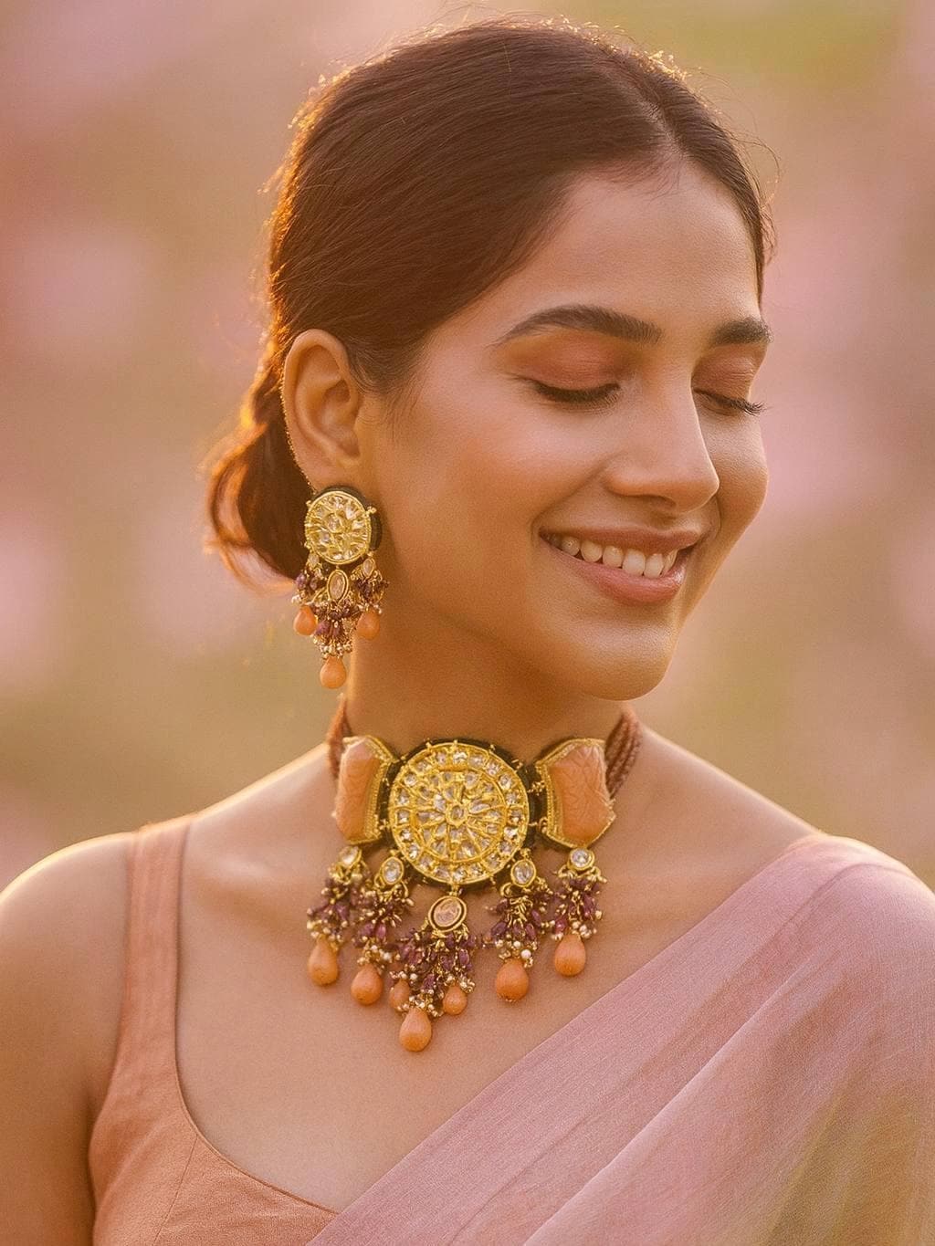 Handcrafted Polki Kundan Peach Orange Stone Choker Necklace with Earrings | Bridal Statement Jewelry | Indian Wedding Jewelry