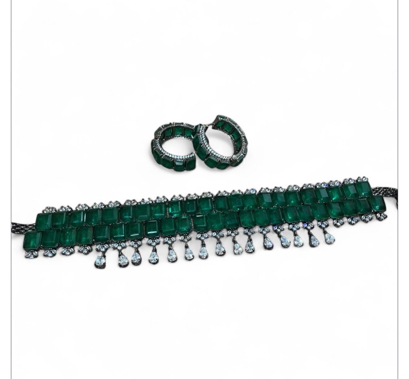 Make a bold statement on your special day with this Sabyasachi-inspired green emerald choker necklace set, beautifully handcrafted with CZ stones, green emerald doublets, and Victorian-style detailing. This black rhodium plated choker set exudes regal charm — perfect for receptions, weddings, or high-fashion bridal looks.