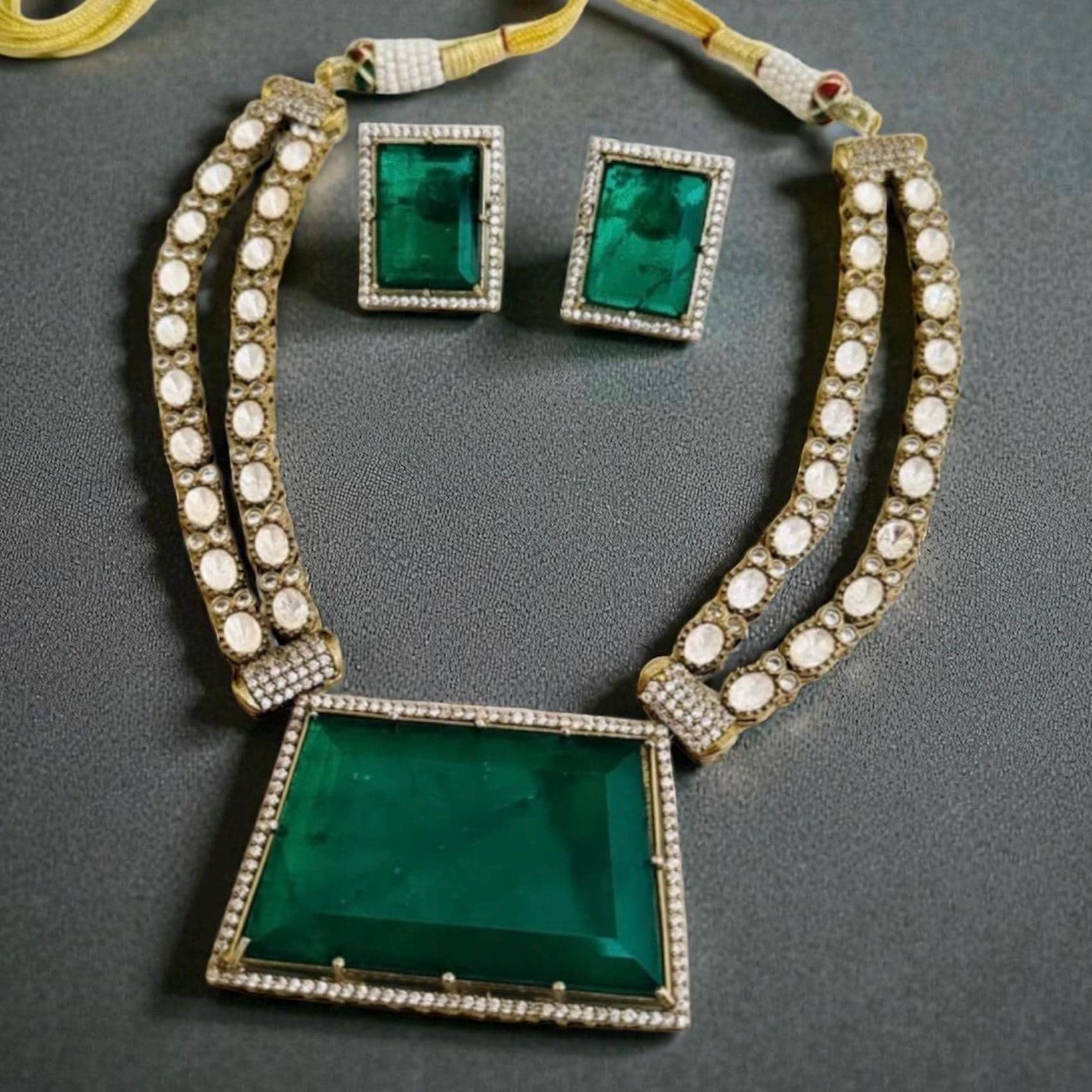 Moissanite Kundan Necklace: Emerald Green Stone, Victorian Polish Bridal Jewelry