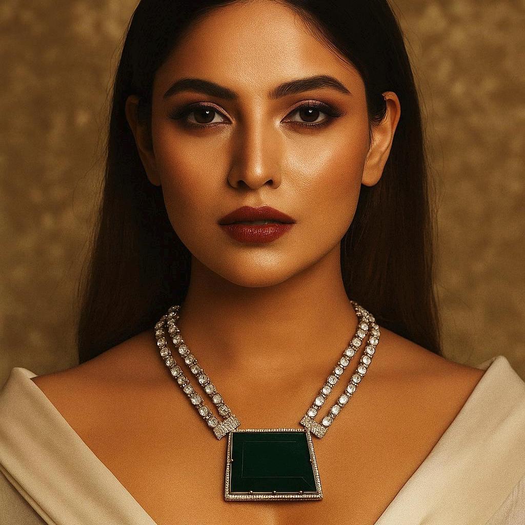 Turn heads with this luxurious statement necklace featuring a stunning emerald green doublet stone centerpiece, beautifully framed with dazzling moissanite polki stones. The dual-layered design showcases high-quality kundan craftsmanship, giving it a regal and refined look—perfect for weddings, festive occasions, and grand celebrations.