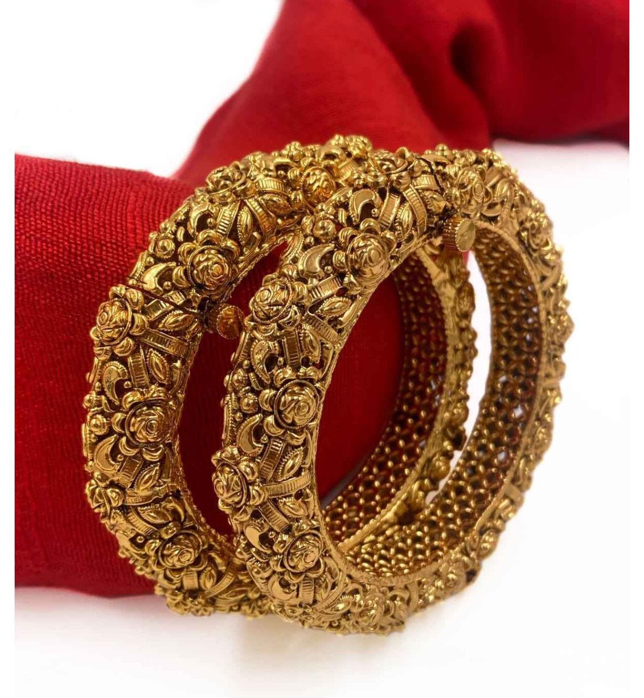 Bring home the charm of timeless Indian craftsmanship with these stunning screw-openable bangles in an antique matte gold finish. Intricately designed with fine detailing and a luxurious texture, these bangles are the perfect accessory for weddings, festivals, or everyday elegance.