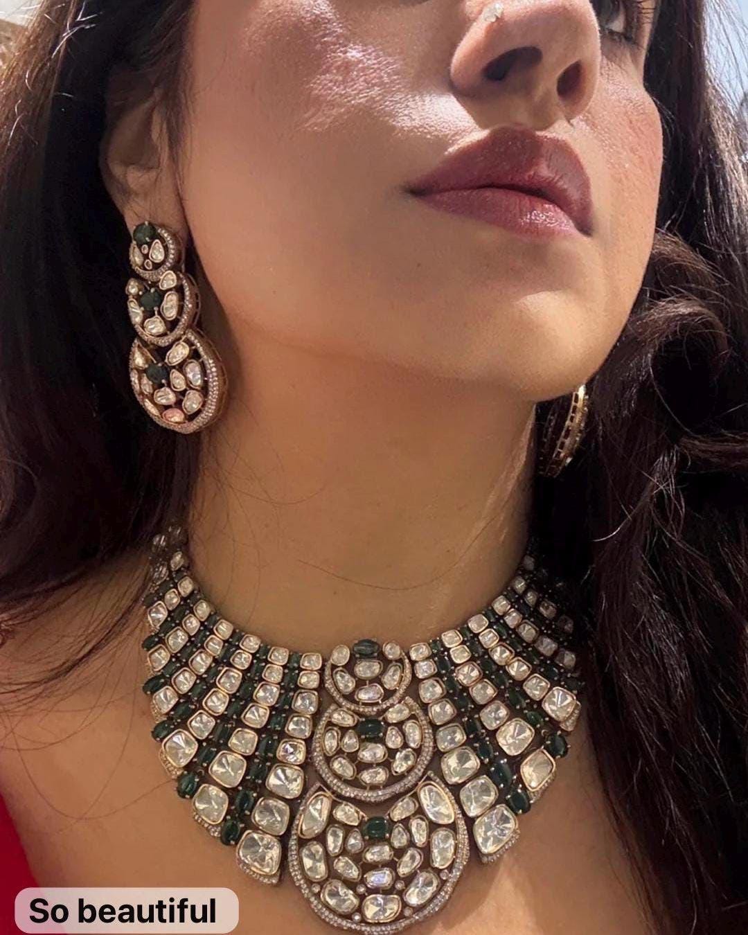 Elevate your jewelry collection with this breathtaking green Polki Kundan choker necklace set, a design that captures timeless royal elegance and modern sophistication. Crafted in a bold, statement silhouette, this piece features luminous Polki-style stones paired with rich green accents, creating a striking contrast that instantly draws attention.