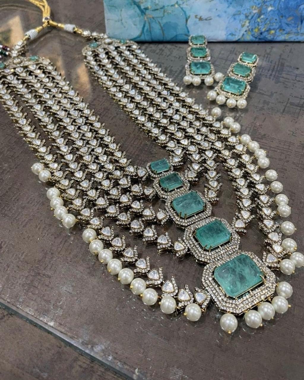 Sabyasachi inspired layered Green Emerald Moissanite Polki Necklace Set: Polki Kundan Bridal Jewelry