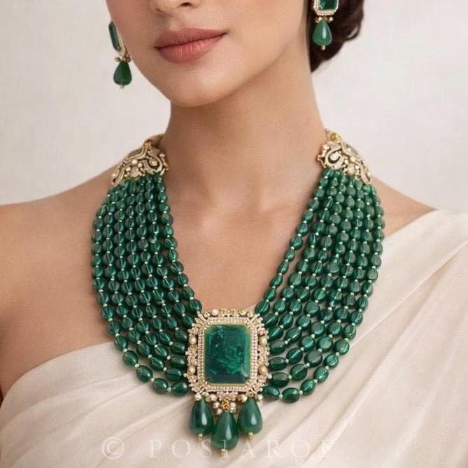 Make a timeless statement with this luxurious green emerald Polki Necklace Set, thoughtfully handcrafted by skilled artisans of India.