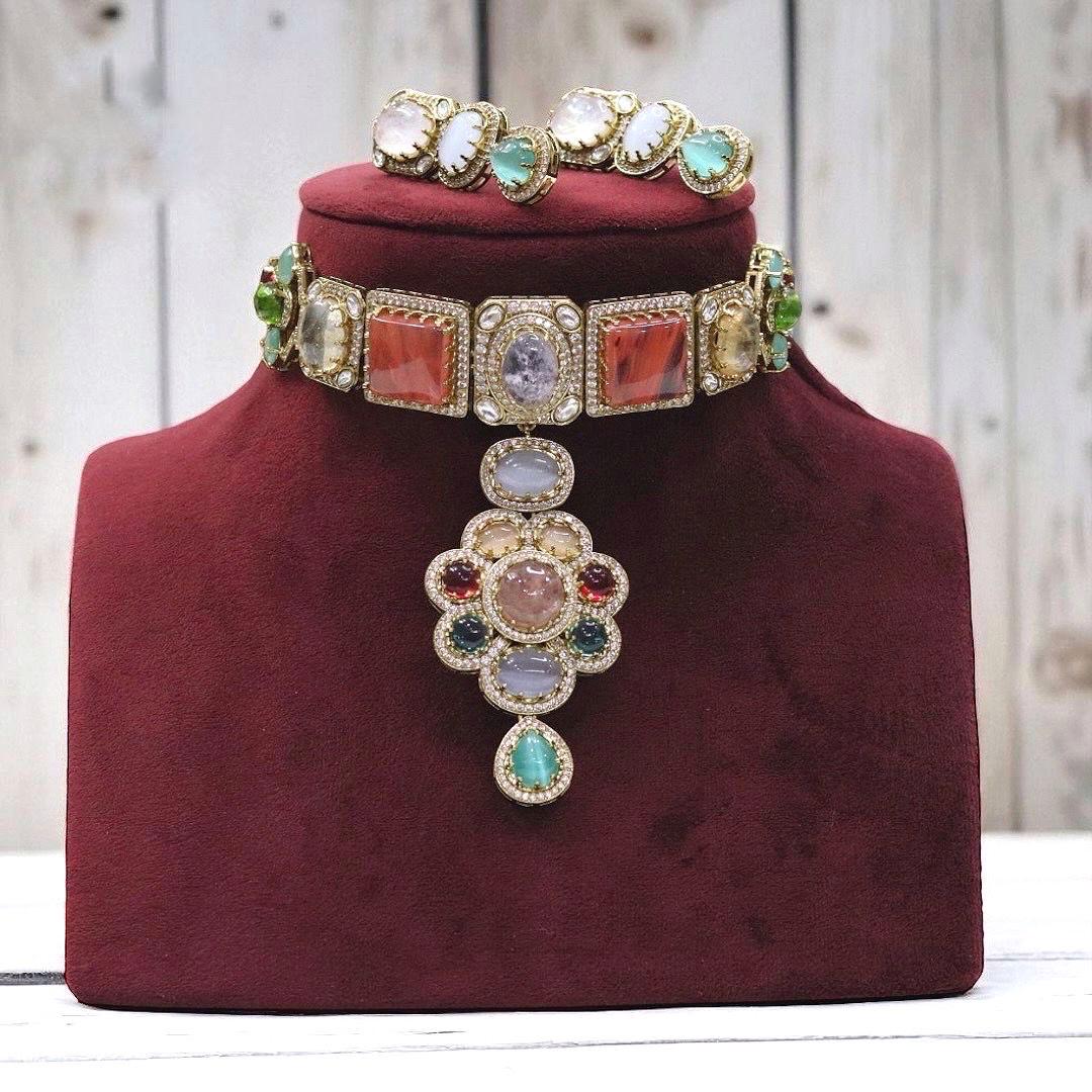Multicolored Fusion Gemstones Moissanite Polki Choker and Earrings: Indian Bridal Jewelry