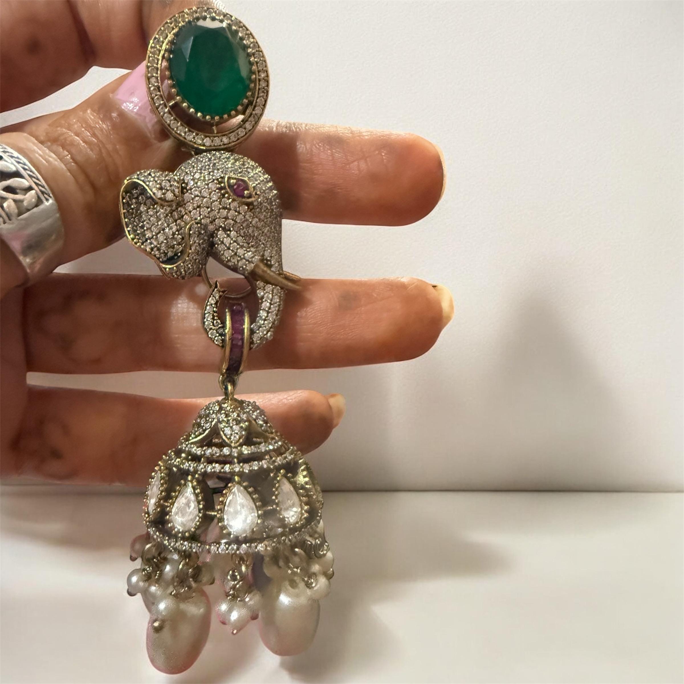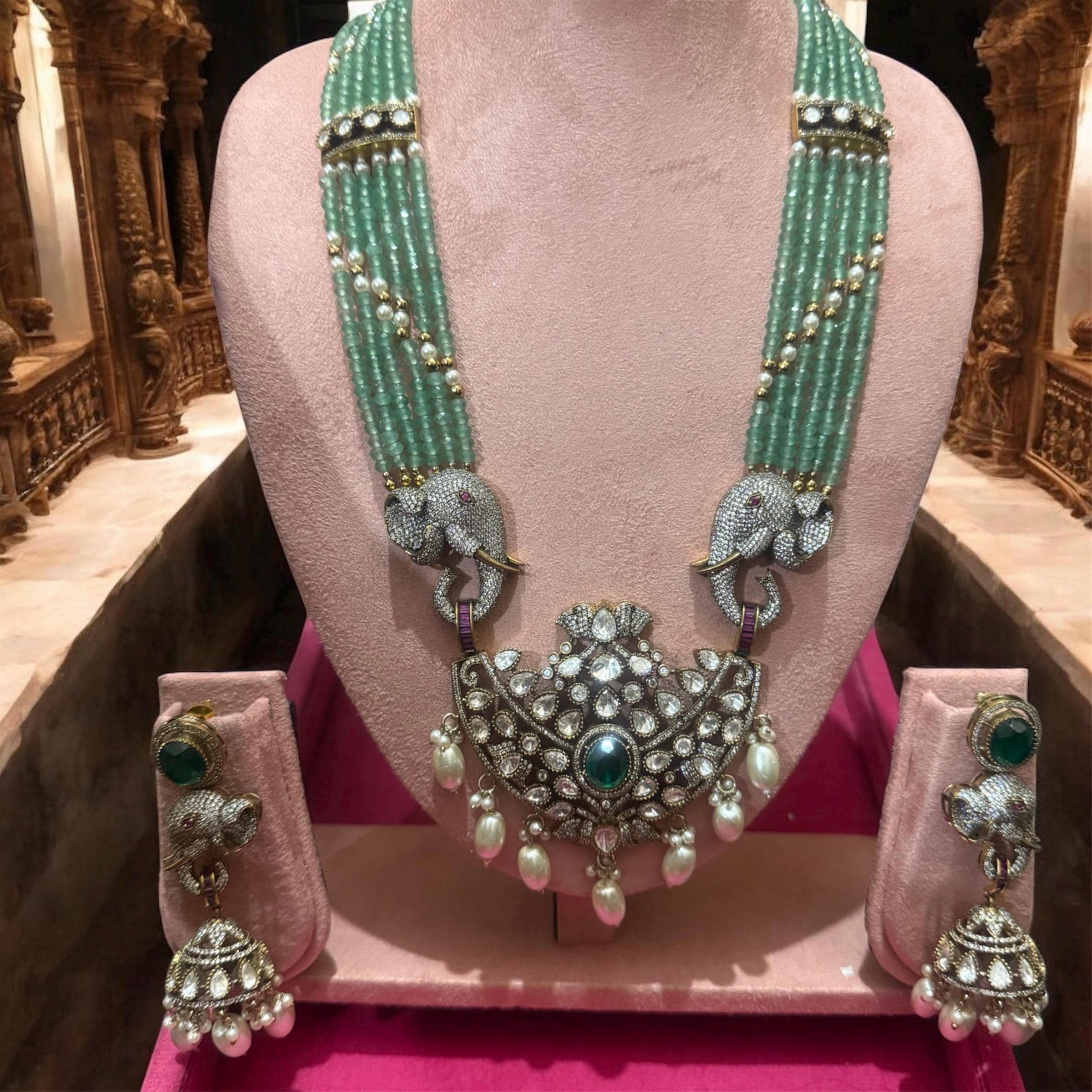Mint Green Victorian Moissanite Polki Kundan Elephant motifs Jewelry Setting : Antique Gold Plated Necklace with Earrings