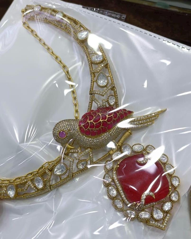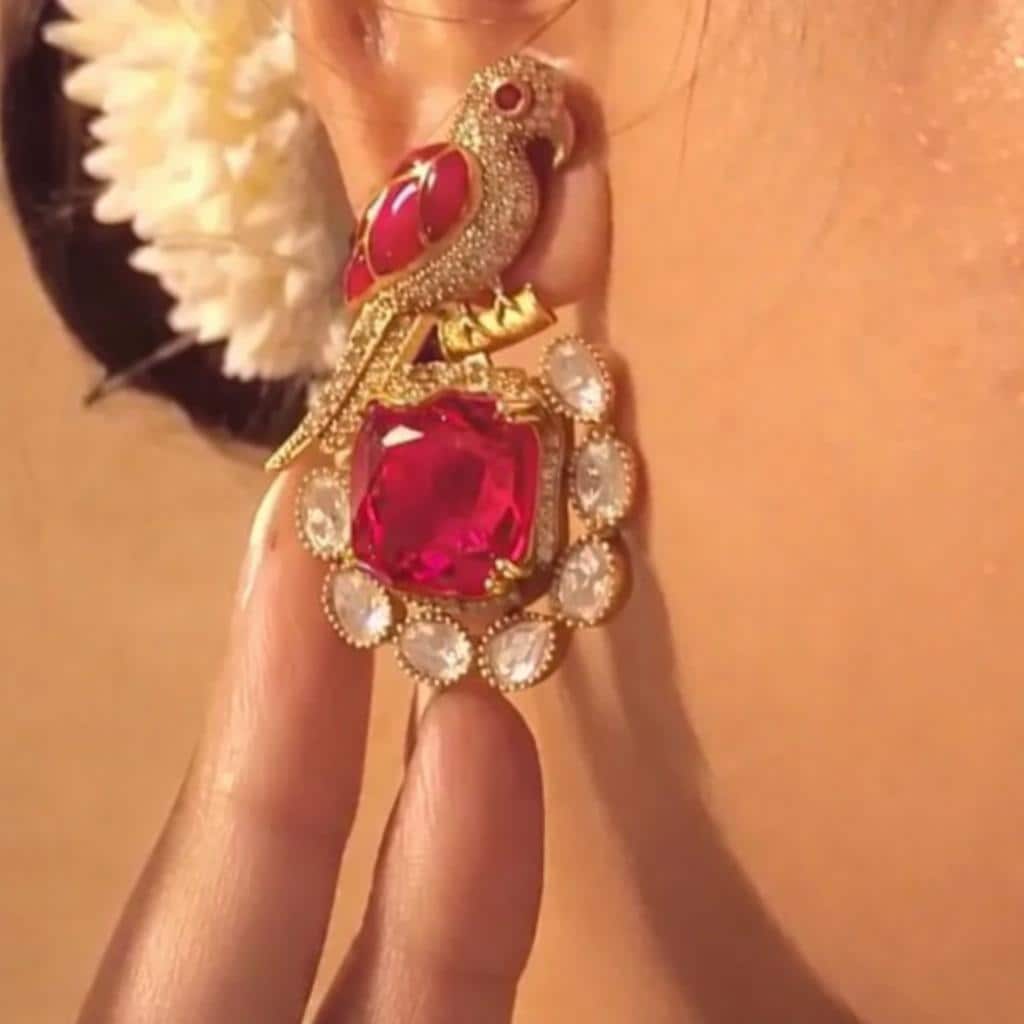 Red Ruby Parrot Motif Moissanite Polki Necklace Set | Handcrafted Indian Bridal Jewelry | Gold Plated Kundan Set