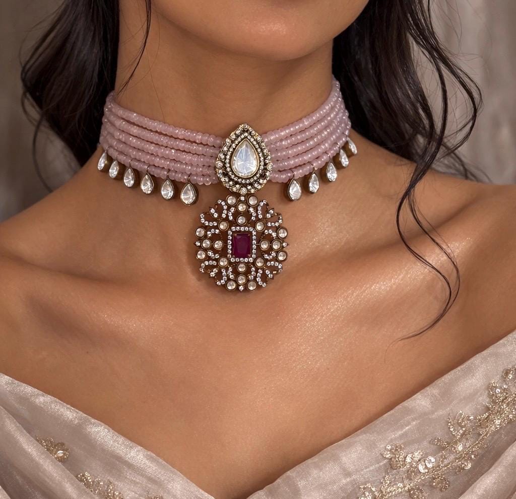 Step into refined elegance with this stunning blush pink multi-strand choker set, beautifully accented with a royal Polki-style pendant and matching earrings. Designed for the modern bride and luxury-event style lovers, this piece blends traditional charm with a soft, romantic palette — perfect for wedding ceremonies, sangeet, receptions, or a glam festive soirée.