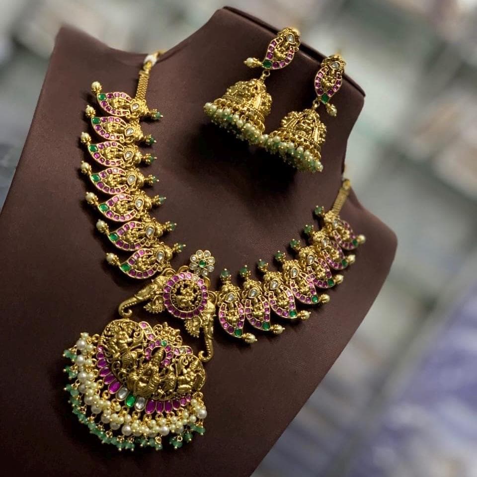 This set features intricate Goddess Lakshmi motifs, surrounded by ruby and emerald-colored stones, finished in rich antique gold for a regal, heirloom look.