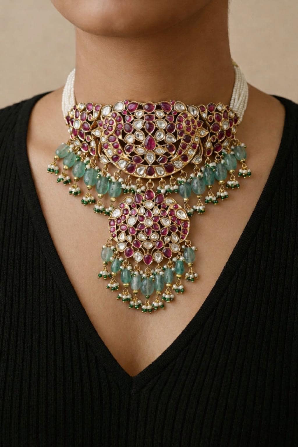 Indulge in timeless royal elegance with this Moissanite Jadau Polki Choker Necklace Set, exquisitely handcrafted for brides who appreciate heritage artistry with a modern soul. Inspired by iconic Sabyasachi-style bridal jewelry, this choker features rich ruby-toned Polki work, luminous moissanite stones, and graceful drops of semi-precious emerald beads that add movement and opulence.
