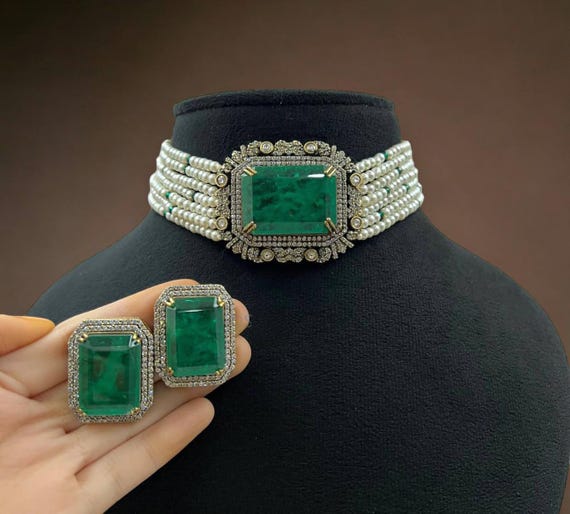 Sabyasachi Inspired CZ green emerald doublet stone premium quality choker jewelry set, earrings, American Diamonds , next to real diamonds